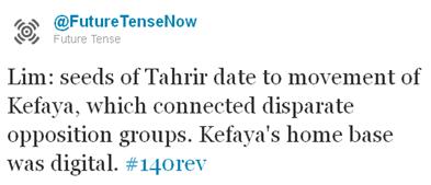 The coolness of this moment immediately hit me. As I sat in this event—crammed into a corner of a crowded room, head buried in my laptop, tweeting take-aways on the role of internet and technology in social movements—an activist in Tahrir Square was also following the event’s Twitter hashtag (#140rev), saw that I was participating in the conversation, found out it was my birthday (presumably via Facebook), instantaneously sent me a message directly to my phone, and then followed up with a photo of her view of Tahrir Square at that very moment.