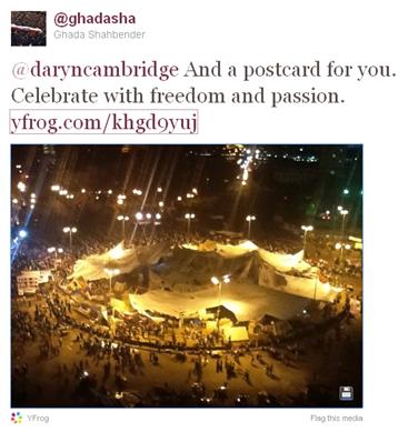 It’s cool not just because an amazing activist like Ghada Shahbender, whom I had recently met for the first time at the Fletcher Summer Institute for the Advanced Study of Nonviolent Conflict, would think to send me a birthday message, but also because this short 140 character or less digital exchange, encapsulated what is, for me, the power of social media—the connections it can help sustain, the conversations it can create across great distances, and the ability it gives people to instantly share and document key moments.