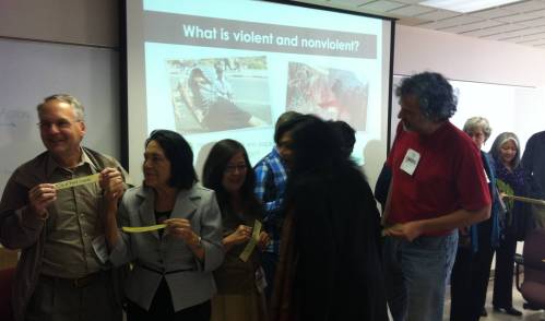 The five exercises I intended to facilitate explored approaches to conflict, conceptions of power, how we determine if something is violent or nonviolent, nonviolent conflict analysis, and developing nonviolent strategy. I say, “intended,” because is is often the case with my workshops, I tend to include more than the time allows. With that we were really only able to do three of the activities.