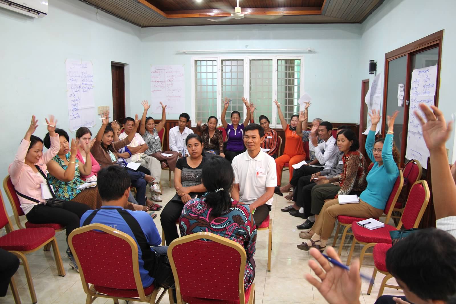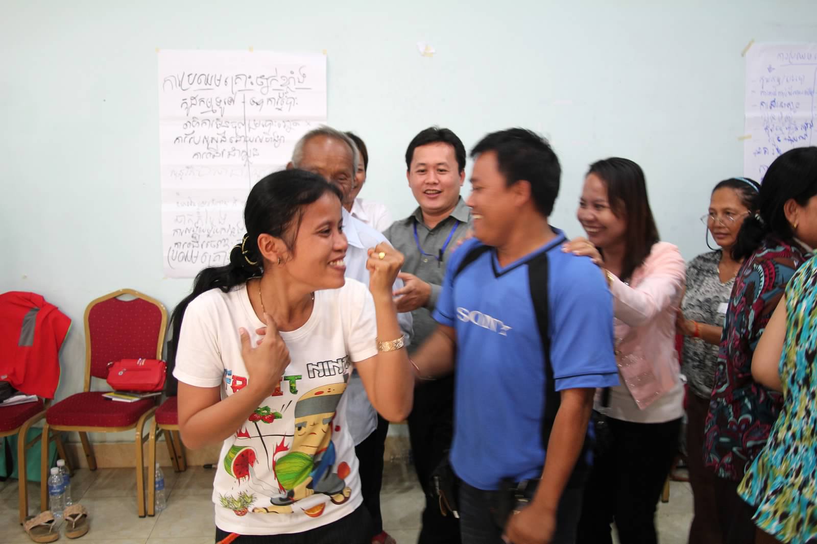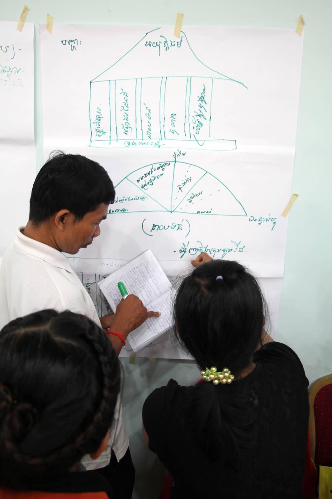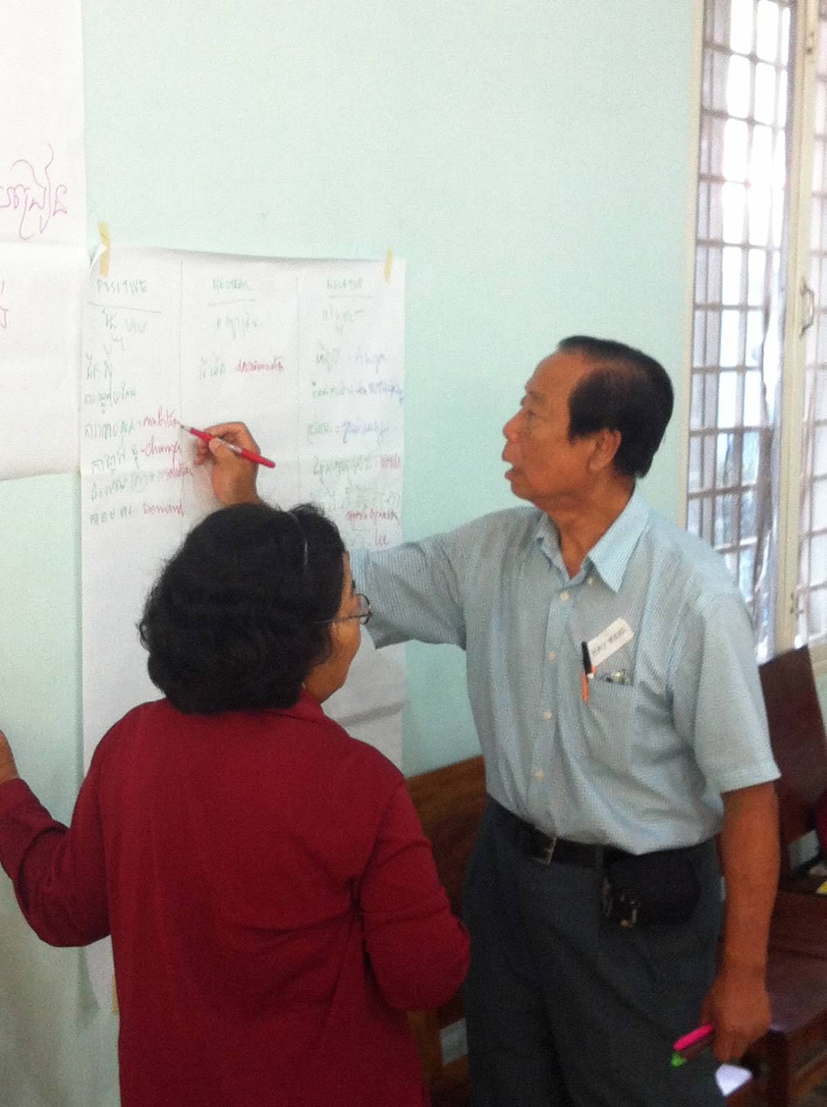 Visions of Tomorrow / Group Drawings – One of the first exercises we did in small group was for participants to discuss their “vision of tomorrow” for Cambodia and to then create a drawing or visual representation of that vision. This exercise served two main goals. The first was for issues and problems within Cambodia to emerge and be discussed within the small groups. The second was for these issues (and the conversations that raised them) to be visually present during the entire workshop to better inform and remind not only the participants, but also the facilitators, about what is motivating and driving the learning in the room. Each of the drawings were hung up around the room and remained there throughout the various sessions. There were several occasions where some of the drawing were referred to during later mini-lectures and discussions – the fish one in particular. This is an immediate way for participants to gain ownership over the learning experience.
