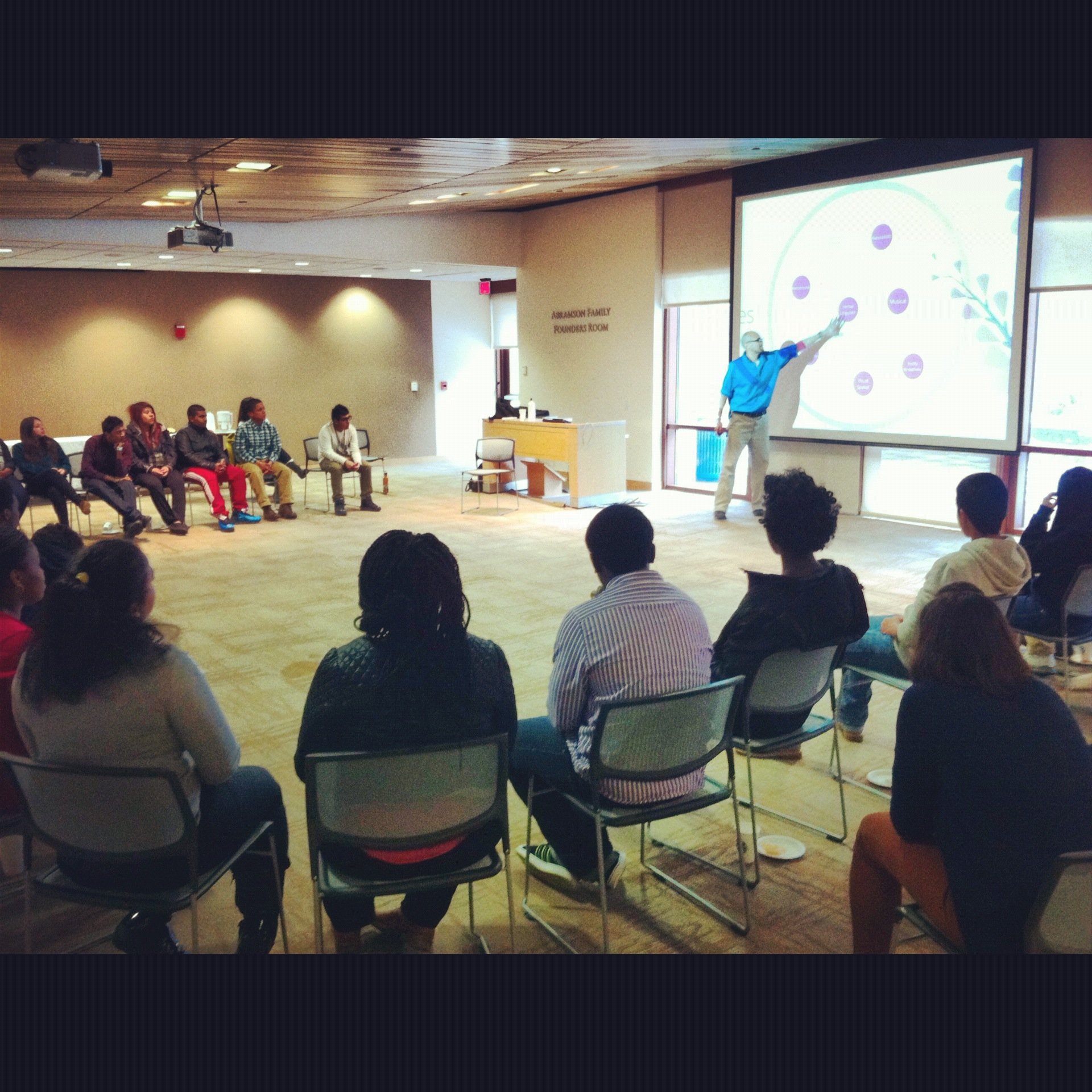 The other thing that I tried out during the presentation was to give the students the opportunity to decide what was discussed and explored in greater depth. Since this was only an hour long presentation I knew there would not be enough time to cover all the various themes and topics in this framework. After all, I have an entire, semester-long class that does that. How am I supposed to do justice to ALL these ideas in an hour? So what I did was I listed some of the concepts, activities, and tools that are part of each blossom and I let the students vote on which one they wanted to discuss. As you will see in the picture below, this was a short yoga routine I led after the students voted to learn more about how yoga and mindfulness can be integrated into classrooms.