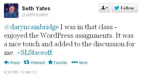 These two tweets are in reference to a comment I made about how I use WordPress socially with the various classes I teach at AU. The example I gave was how I use comment sections on the class websites I create on WordPress for students to “ease in and out of class.”