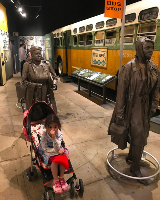 Kaiya among the statues of women walking to work, refusing to ride a segregated bus system.